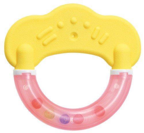 Прорезыватель-погремушка, круглой формы, изготовлен из мягкого безопасного материала.