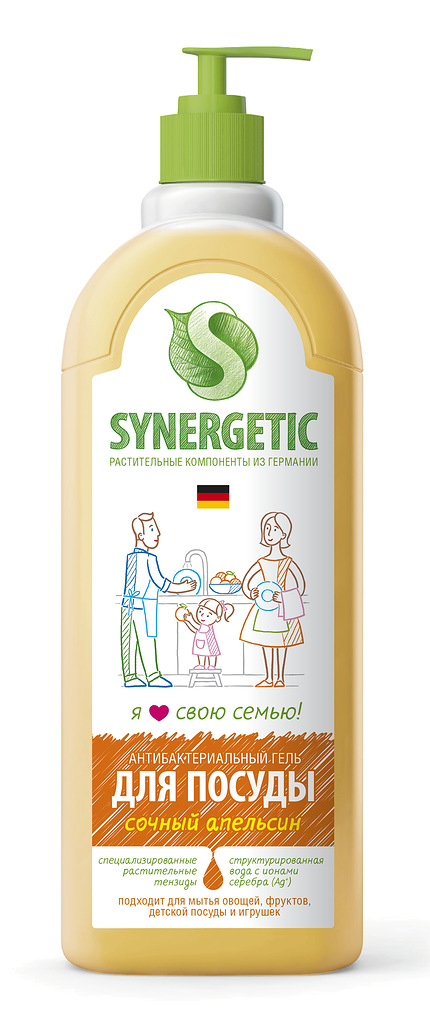 Безопасное средство с ароматом сочного апельсина для мытья посуды, детской и взрослой, фруктов и овощей, а также игрушек, которые дети так любят тянуть в рот. На 100% смывается и удаляет органические загрязнения. Устраняет запахи и жир при любой температуре воды. Средство Synergetic биоразлагается в воде и не вредит микрофлоре септических установок.