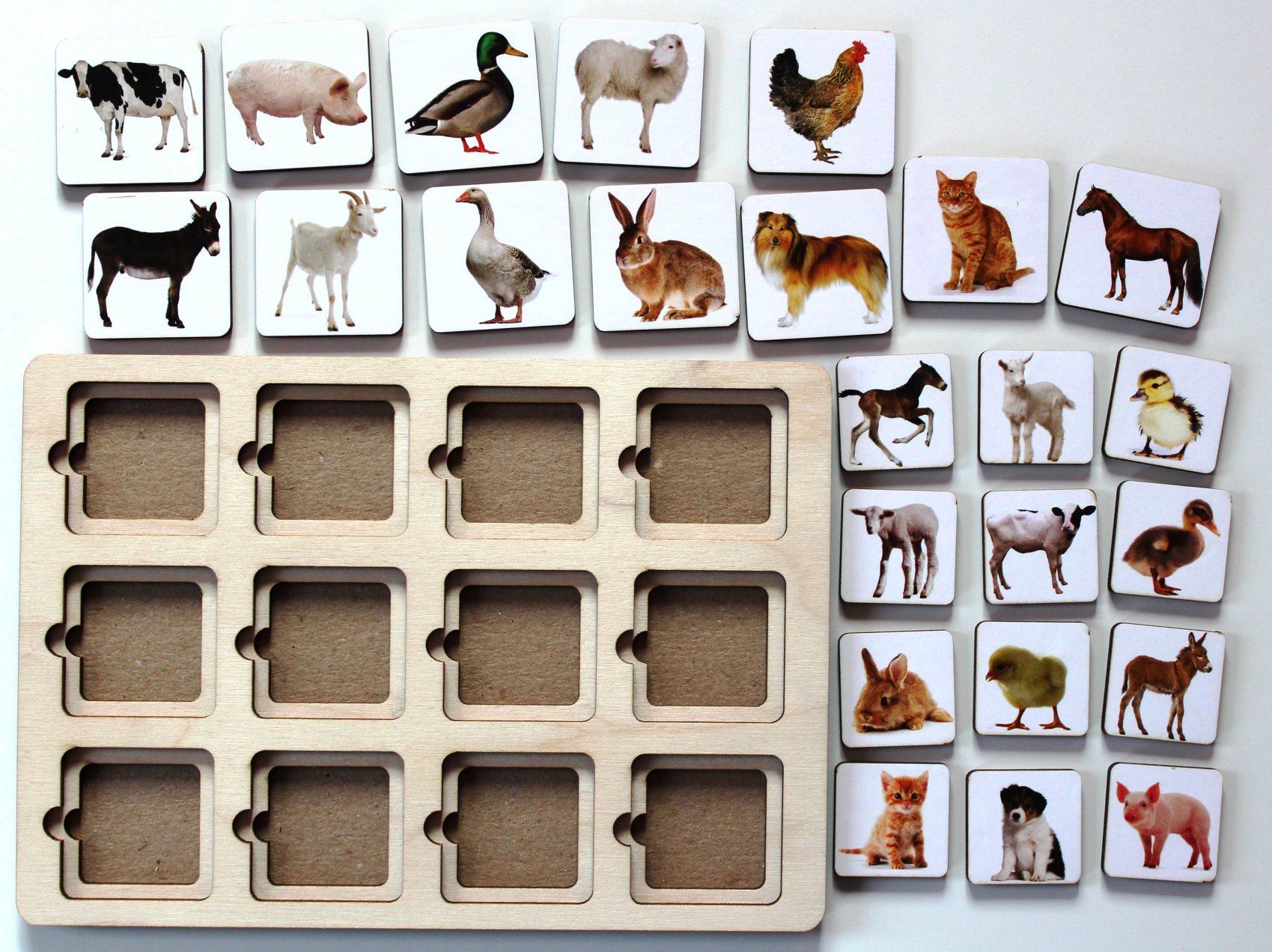 4. Изучайте понятия <<верх>> - <<низ>>, <<справа>> - <<слева>>. Попросите ребенка выложить в верхний ряд планшета: собаку, кошку, осла и утку, а в нижний ряд: корову, козу, лошадь и курицу. Попросите ребенка назвать животных, которые находятся справа на планшете; слева на планшете...