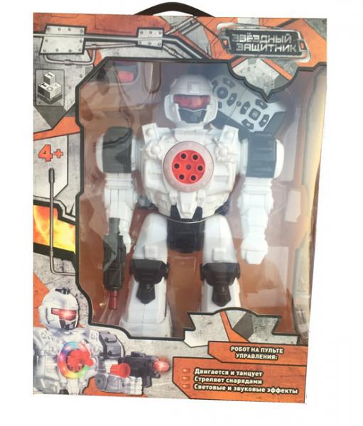 Радиоуправляемый робот "Звездный защитник" от бренда 1Toy выглядит как суровый космический страж, облаченный в непробиваемую броню. На вооружении робота имеется бластер, а когда мощности бластера не хватает, звездный защитник может выстреливать снарядами на липучках из встроенной на груди пушки. Во время стрельбы диск пушки переливается разными цветами.